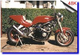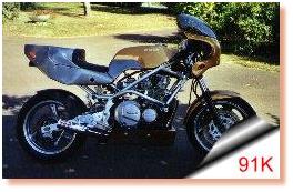 My project was begun in 1993 with the delivery of the chassis from Europe .. the standard martin rear wheel was widened to 5.75 inches from kosman in cali. the body work was grafts from various other machines .... fairing gsxr, seat and tail were custom glass pieces.tank shell from martin has been bladdered and foamed. bimota footpegs , ducati fenderette. and a bevy of race parts make up the 1327 big block turbo charged nitrous engine taken from a 73 kz 900 kawi, an onboard air compressor makes for a nice trick to fool the waste gate into remaining open for severe cornering when the need for 200+HP may hamper carving up some twisty roads, although with a flick of a switch full boost is achieved........ hold onto your helmet..........have shown this bike a few times it's most recognizable award would be best sport bike at cycle world show in Atlanta in 95. Any other info you may be interested in please feel free to give a shout..... good day Mark (CRA-ZI) |