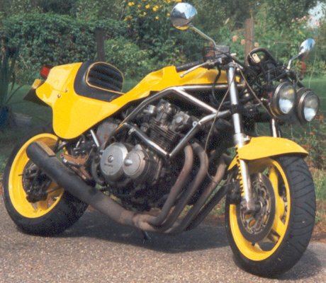 Not very much known. The engine seems to be tuned by FMS-Tuning (does anybody know this company? Mail me!) It did not run for the last 3-4 years. The formal owner owned it for 5 years. The wheels and front end has been changed with a 1989 Suzuki GSX-R1100. This winter I will patch up and recover the bike. | |||