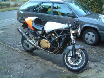Hi My name is Richard Lee I found your site on the Google Search Engine after trying for several years to find out about this rare marque. I have owned my bike for nearly 6 years and bought it as a non runner. I had heard stories of the bike but never guessed I would own it. It was registered in 1988 Frame No KN4068 and has what seems to be (by engine number) a 1984 GPZ900R engine. When I bought it, it had Dymag wheels (18" Rear & 16" Front) which I changed for ZZR600 17" wheels. The original forks were from the doner GPz and have been changed for ZX9R C1 Forks mounted in Harris adjustable offset yolks. Brakes are also ZZR600 4-pot callipers. | |||