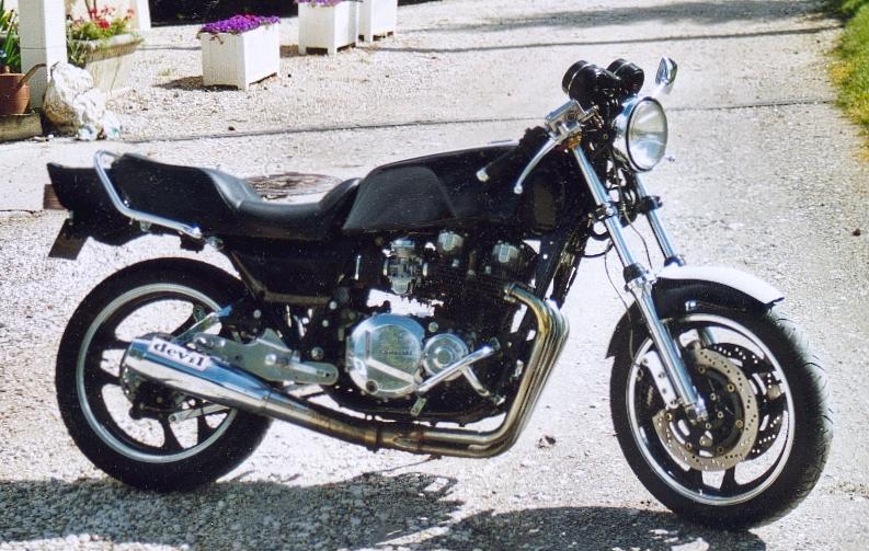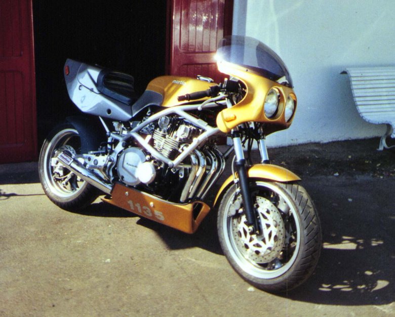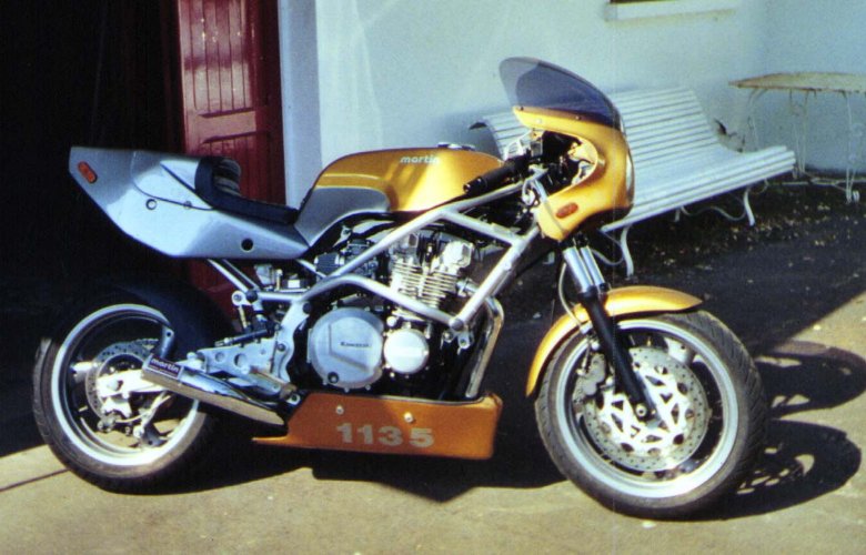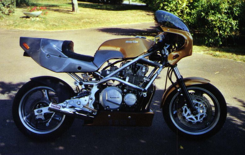 Martin, moteur Kawa 1000R de 1980 , Moto Complète MARTIN (jantes, reposes pieds, tête de fourche 2 phares etc. ?.. ) ,actuellement remise au goût du jour jantes arrière 7,5 , fourche inversée de 900ZXR. (Moto à vendre sur iBazar en Février 2000) |