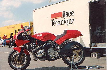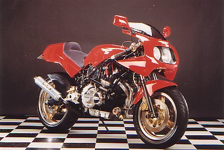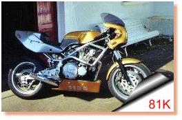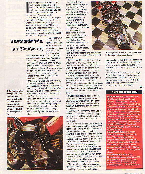 My project was begun in 1993 with the delivery of the chassis from Europe .. the standard martin rear wheel was widened to 5.75 inches from kosman in cali. the body work was grafts from various other machines .... fairing gsxr, seat and tail were custom glass pieces.tank shell from martin has been bladdered and foamed. bimota footpegs , ducati fenderette. and a bevy of race parts make up the 1327 big block turbo charged nitrous engine taken from a 73 kz 900 kawi, an onboard air compressor makes for a nice trick to fool the waste gate into remaining open for severe cornering when the need for 200+HP may hamper carving up some twisty roads, although with a flick of a switch full boost is achieved........ hold onto your helmet..........have shown this bike a few times it's most recognizable award would be best sport bike at cycle world show in Atlanta in 95. Any other info you may be interested in please feel free to give a shout..... good day Mark (CRA-ZI) |