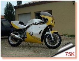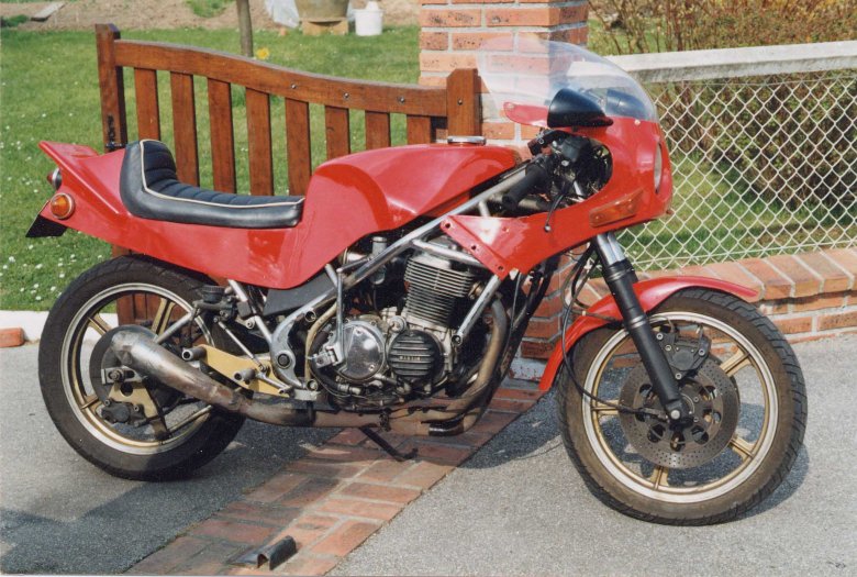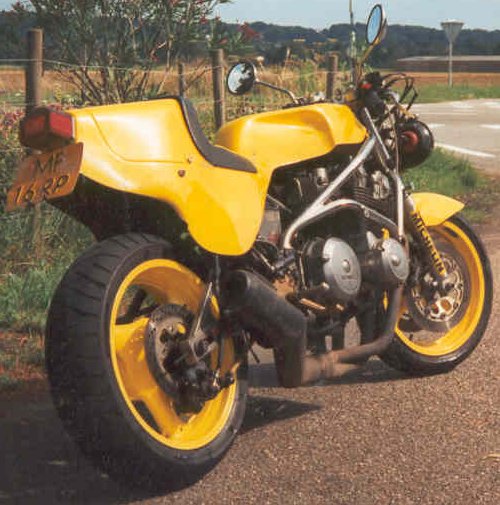 Not very much known. The engine seems to be tuned by FMS-Tuning (does anybody know this company? Mail me!) It did not run for the last 3-4 years. The formal owner owned it for 5 years. The wheels and front end has been changed with a 1989 Suzuki GSX-R1100. This winter I will patch up and recover the bike. | |||