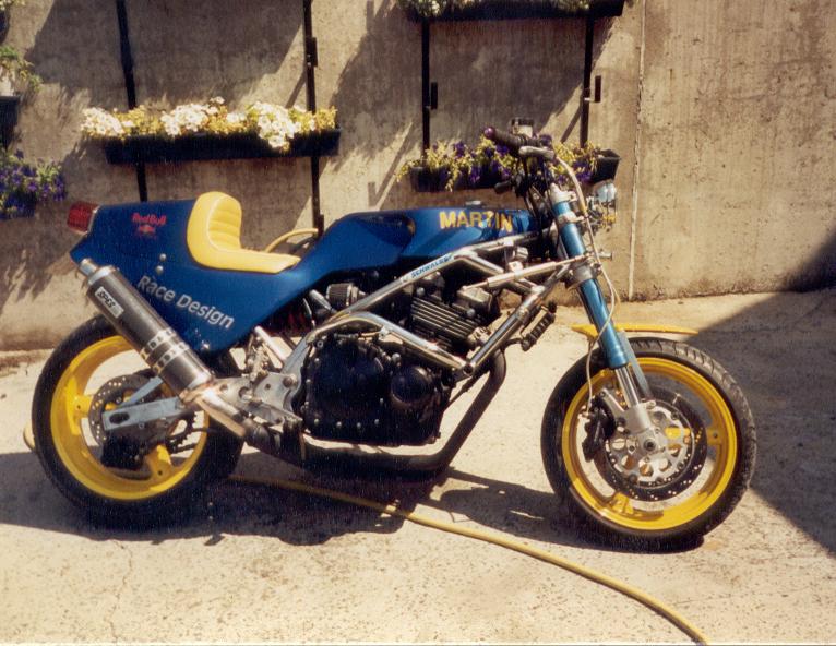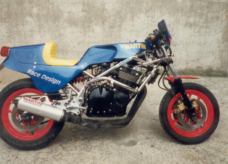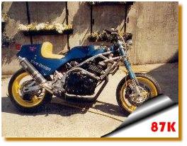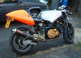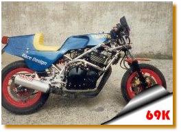 Hi My name is Richard Lee I found your site on the Google Search Engine after trying for several years to find out about this rare marque. I have owned my bike for nearly 6 years and bought it as a non runner. I had heard stories of the bike but never guessed I would own it. It was registered in 1988 Frame No KN4068 and has what seems to be (by engine number) a 1984 GPZ900R engine. When I bought it, it had Dymag wheels (18" Rear & 16" Front) which I changed for ZZR600 17" wheels. The original forks were from the doner GPz and have been changed for ZX9R C1 Forks mounted in Harris adjustable offset yolks. Brakes are also ZZR600 4-pot callipers. | |||